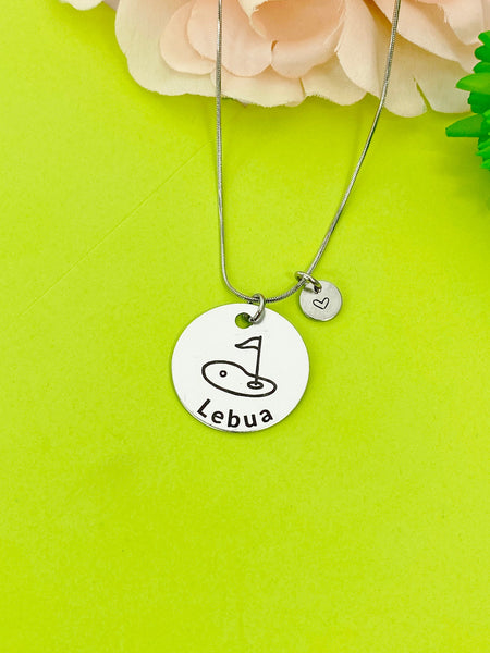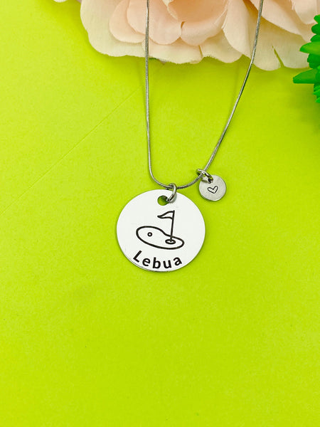 This is an engraving Golf and name on stainless-steel or aluminum with hand stamped heart charm on stainless steel bangle or necklace or split key ring optional.
