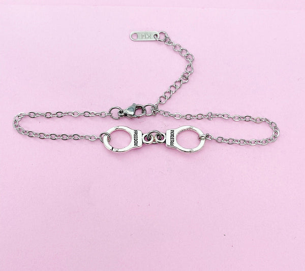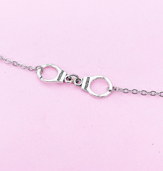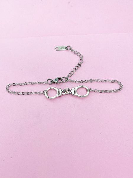 This is a silver-tone handcuff charm on stainless steel chain.