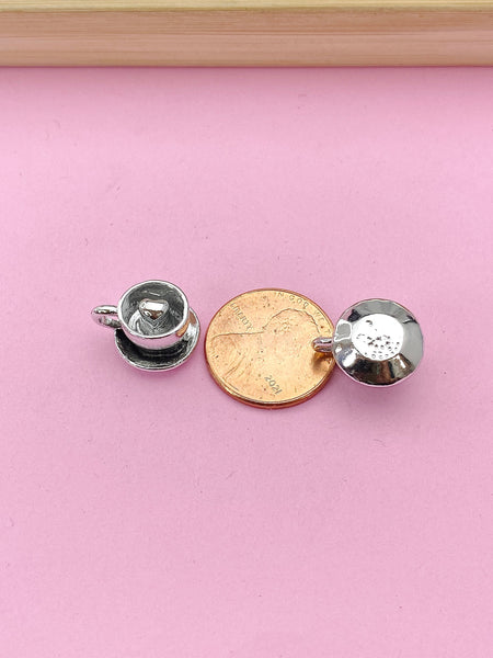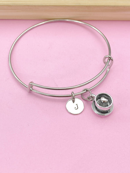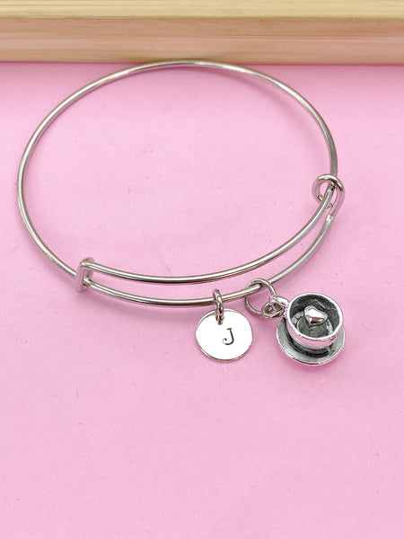 This is a silver-tone coffee cup charm with hand stamped initial charm on Tarnish Resistant stainless steel bracelet.