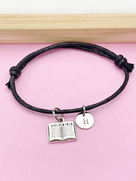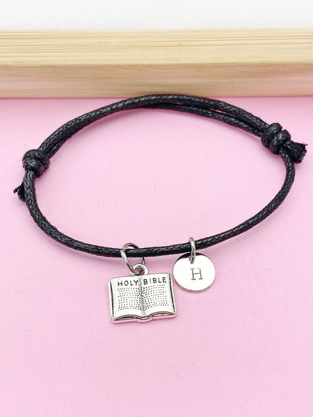 This is a silver-tone Holy Bible charm with hand stamped initial charm on Adjustable Waxed Cord Bracelet.