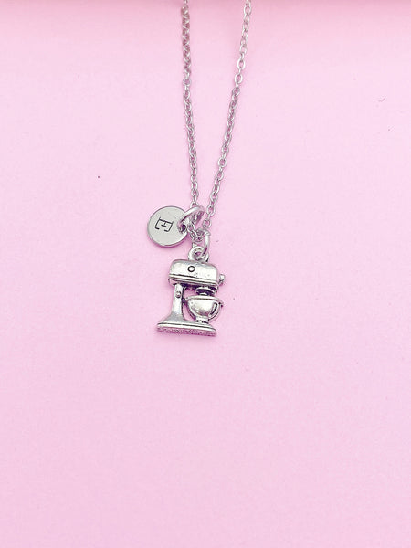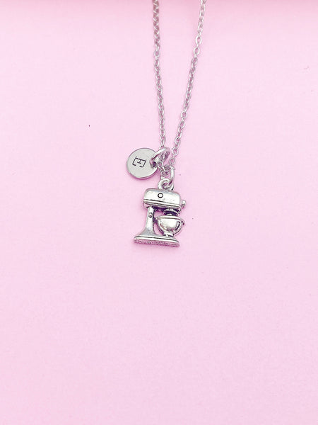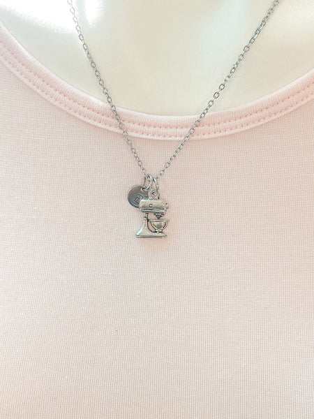 This is a silver-tone kitchen mixer charm with hand stamped initial charm on stainless steel 18 inches chain.
