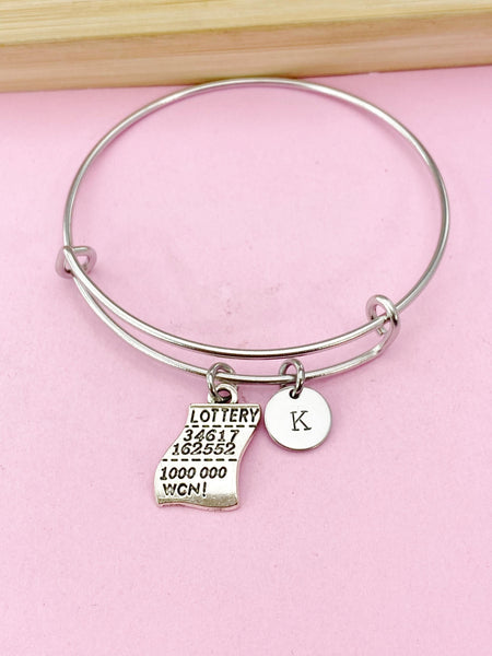 This is a silver-tone lottery charm with hand stamped initial charm on Tarnish Resistant stainless steel bracelet.
