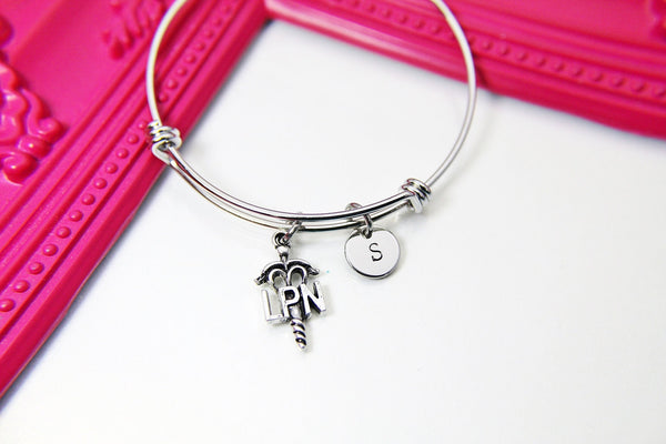 This is a silver tone LPN Caduceus charm with hand stamped initial charm on bangle.