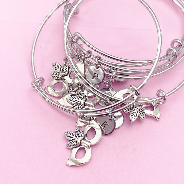 This is a silver - tone Masquerade charm with hand stamped initial charm on 18 inches chain or bangle.