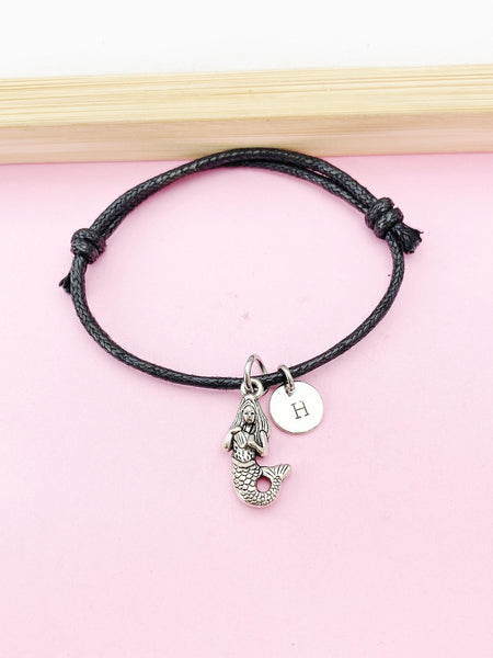 This is a silver-tone mermaid charm with hand stamped initial charm on Adjustable Waxed Cord Bracelet.