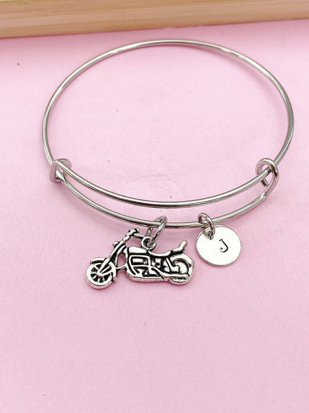 This is a silver-tone motorcycle charm with hand stamped initial charm on Tarnish Resistant stainless steel bracelet.