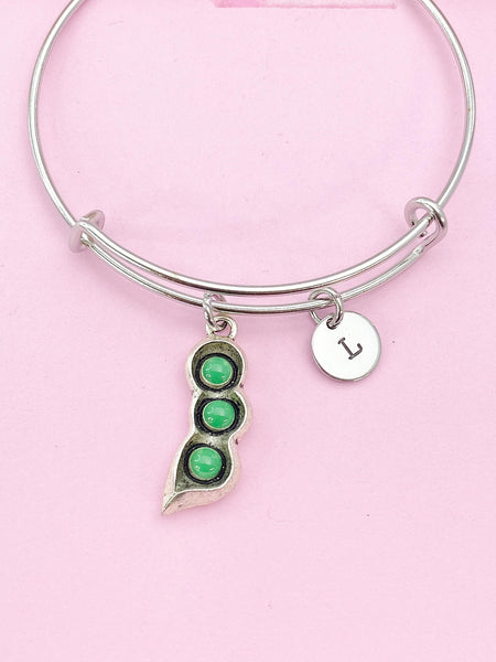 This is a silver-tone pea pod charm with hand stamped initial charm on Tarnish Resistant stainless steel bracelet.