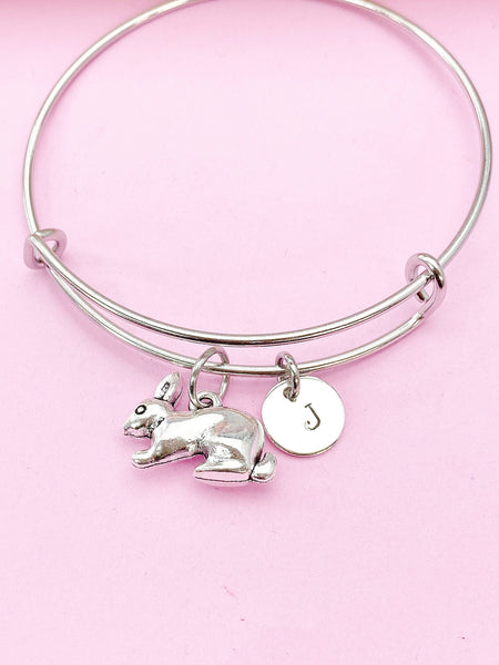 This is a silver-tone rabbit charm with hand stamped initial charm on Tarnish Resistant stainless steel bracelet.