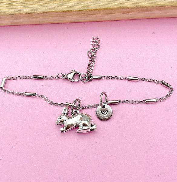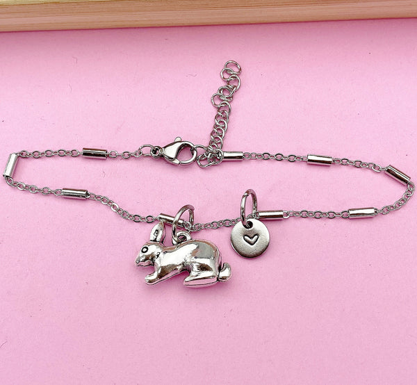 This is a silver-tone rabbit charm with hand stamped initial charm on Tarnish Resistant stainless steel chain.
