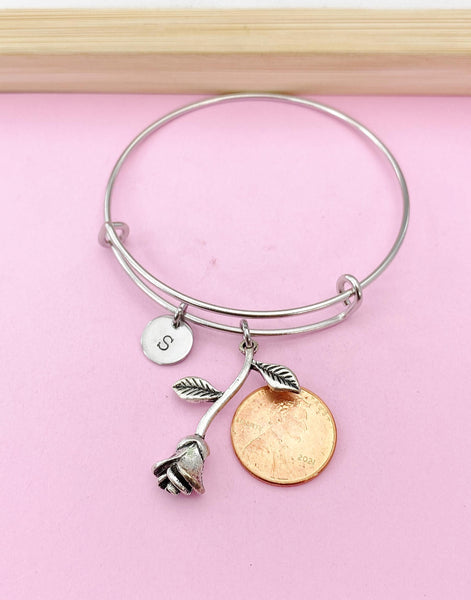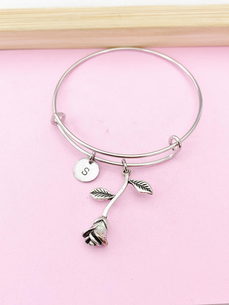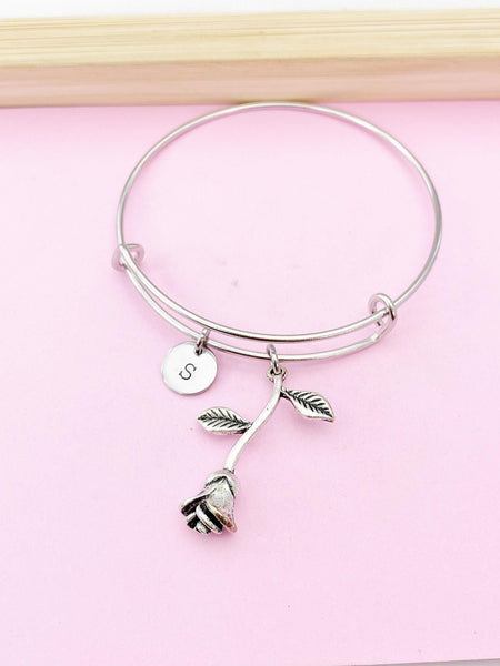 This is a silver-tone rose charm with hand stamped initial charm on Tarnish Resistant stainless steel bracelet.