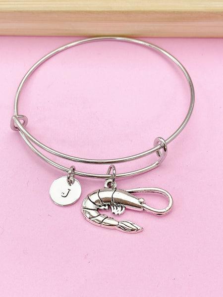 This is a silver-tone shrimp charm with hand stamped initial charm on Tarnish Resistant stainless steel bracelet.