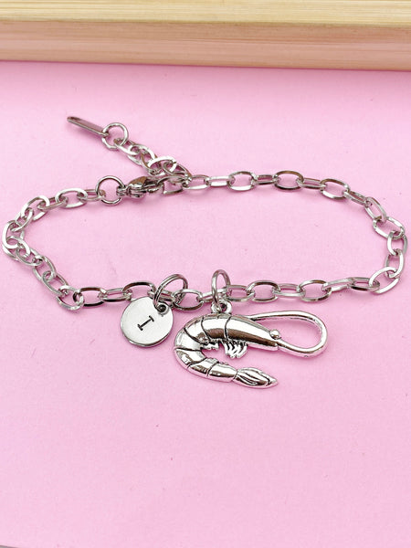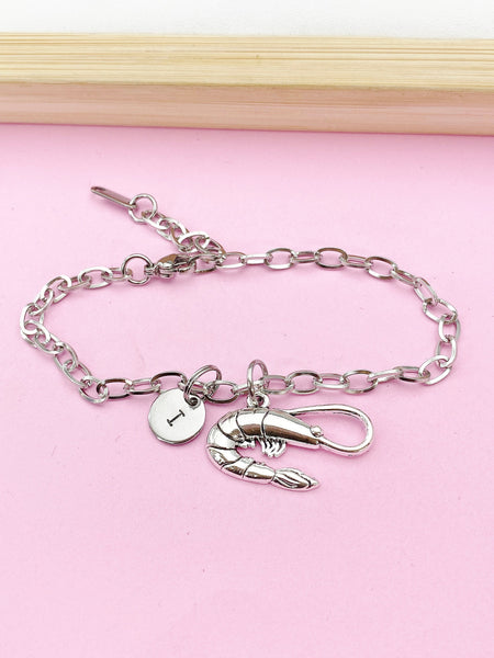 This is a silver-tone shrimp charm with hand stamped initial charm on Tarnish Resistant stainless steel chain.