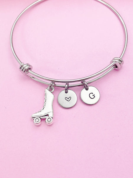 This is silver tone skate charm with hand stamped initial charm on stainless steel bracelet.
