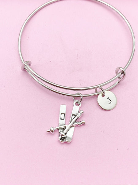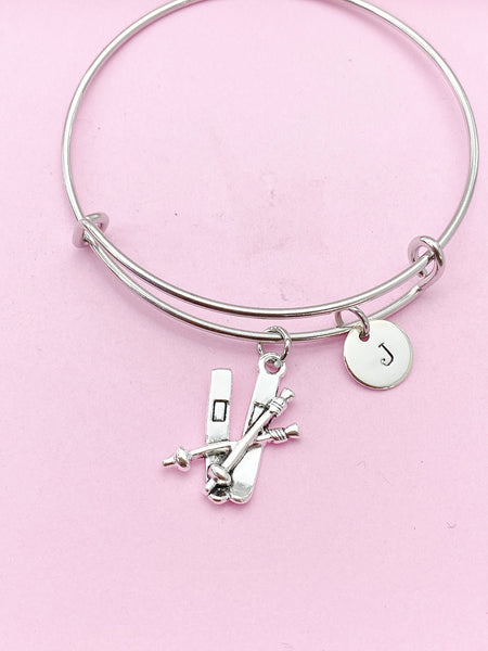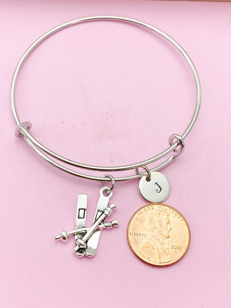 This is a silver-tone ski charm with hand stamped initial charm on Tarnish Resistant stainless steel bracelet.