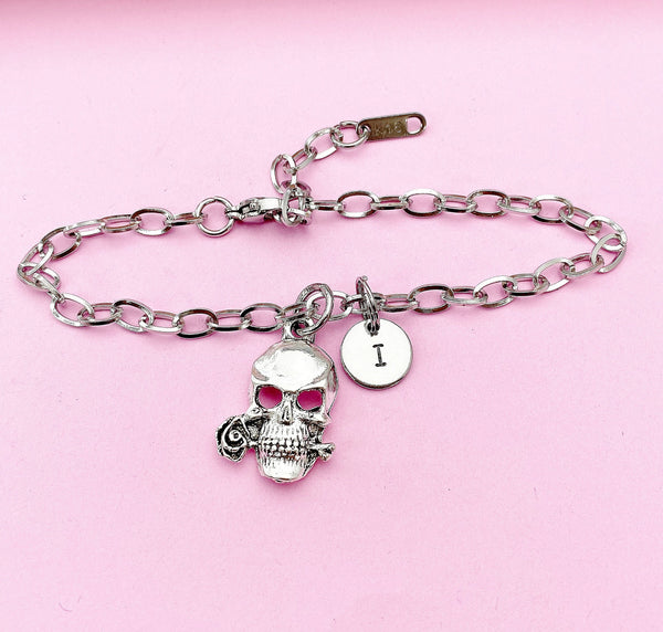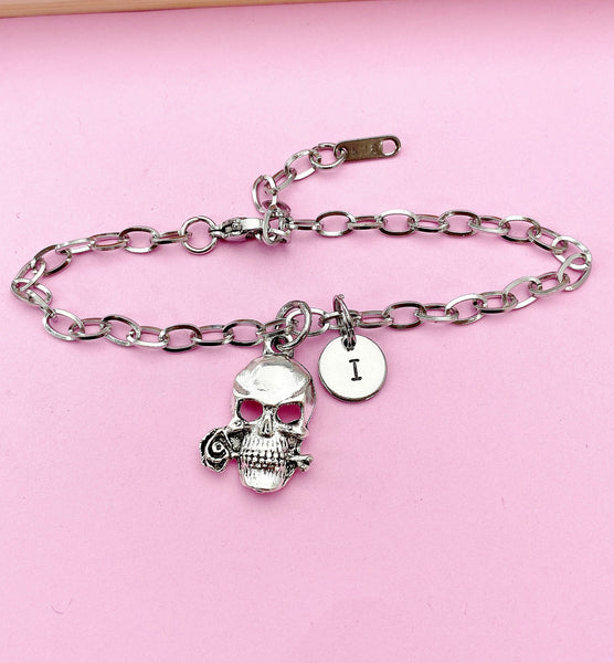 This is a silver-tone skull charm with hand stamped initial charm on tarnish resistant stainless steel chain.