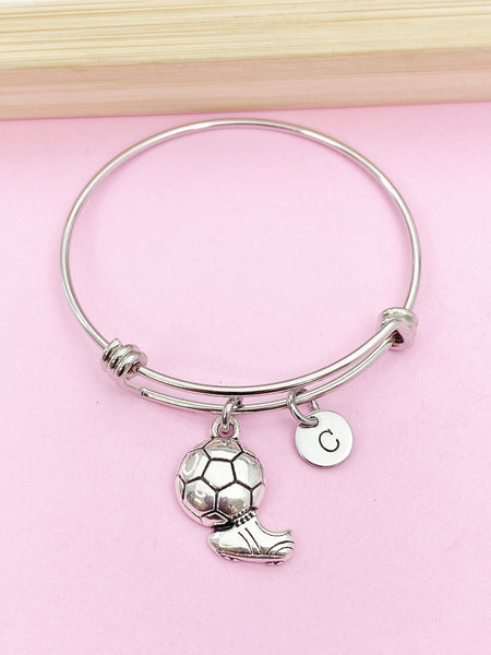 This is a silver-tone soccer charm with hand stamped initial charm on stainless steel bracelet bangle.