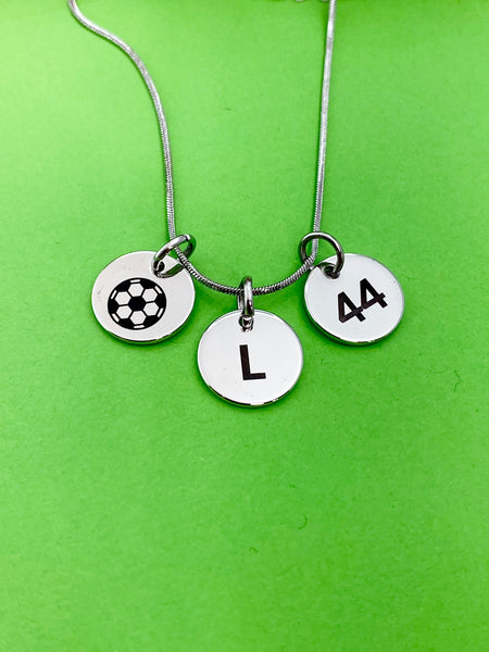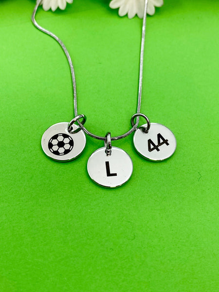 This is an engraving Soccer, Initial and Number on stainless-steel or brass charm on stainless steel bangle or necklace or split key ring optional.