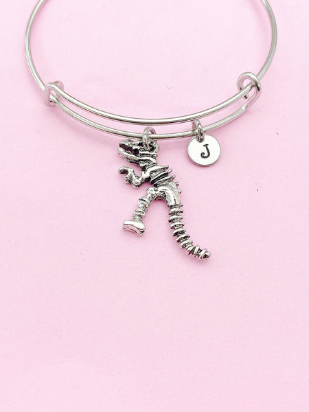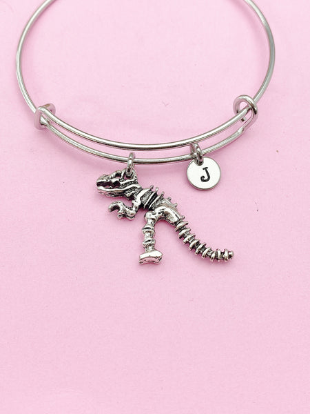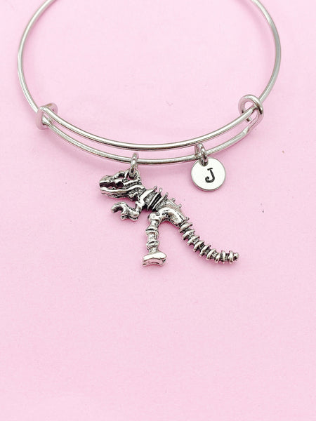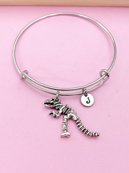 This bracelet features a silver-tone t rex dinosaur charm and a hand-stamped initial charm on a stainless-steel chain.