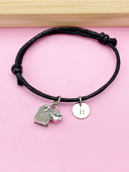 This is a silver-tone tea bag charm with hand stamped initial charm on Adjustable Waxed Cord Bracelet.