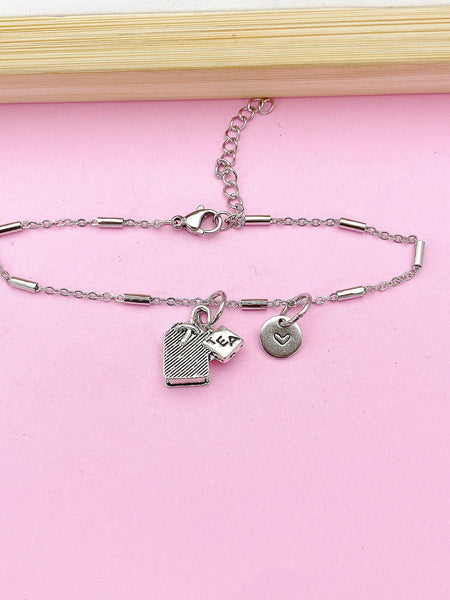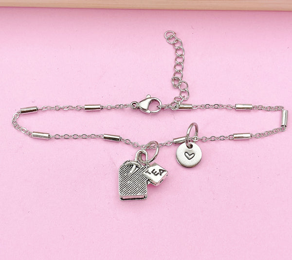 This is a silver-tone tea bag charm with hand stamped initial charm on Tarnish Resistant stainless steel chain.