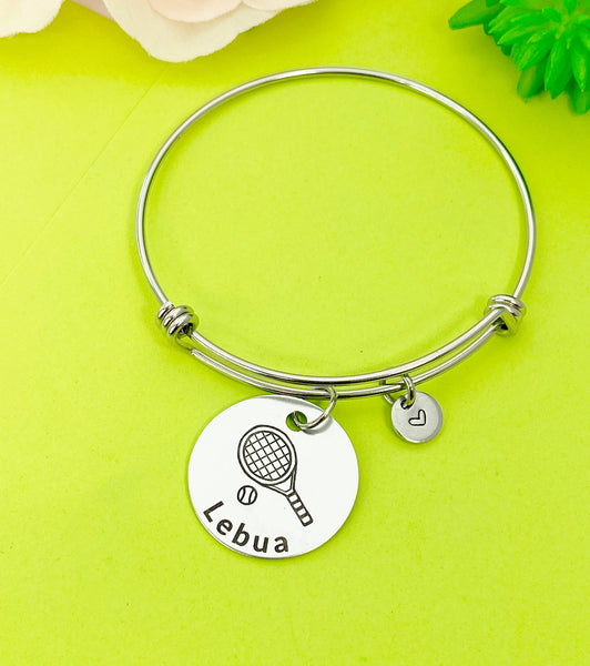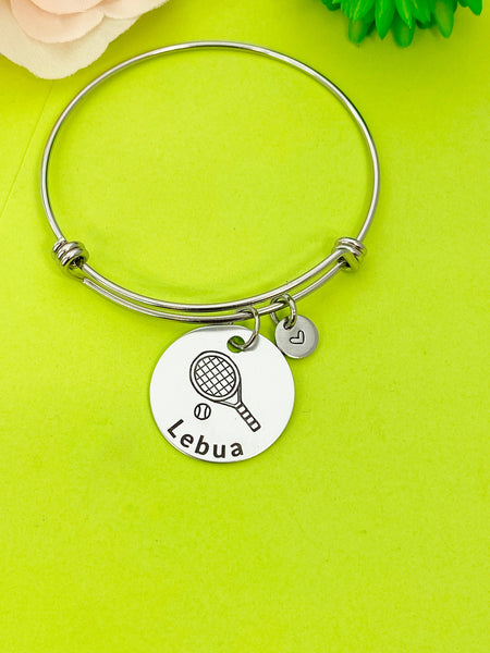 This is an engraving Tennis and name on stainless-steel or aluminum with hand stamped heart charm on stainless steel bangle or necklace or split key ring optional.