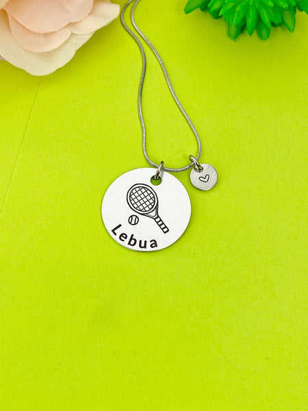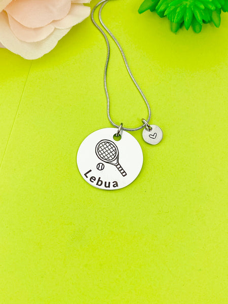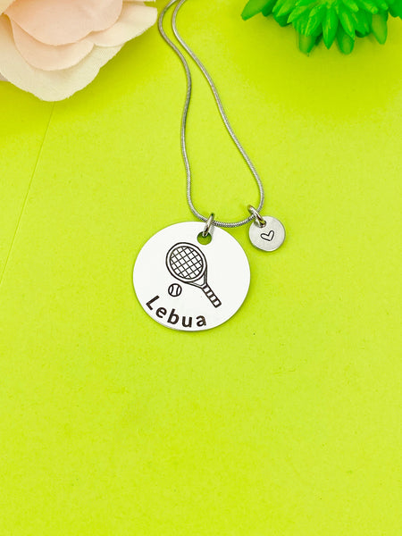 This is an engraving Tennis and name on stainless-steel or aluminum with hand stamped heart charm on stainless steel bangle or necklace or split key ring optional.