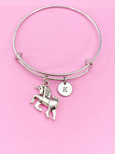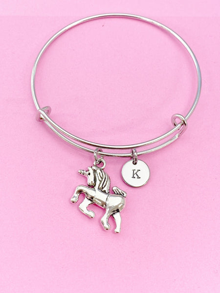 This is a silver-tone unicorn charm with hand stamped initial charm on Tarnish Resistant stainless steel bracelet.