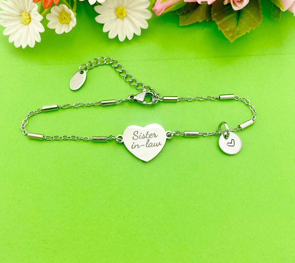 This is an engraving Sister in Law on stainless steel with hand stamp Initial charm on stainless-steel bracelet.