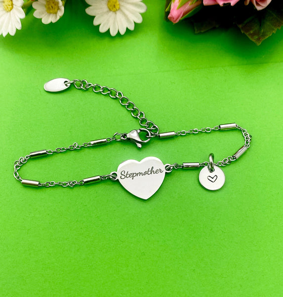 This is an engraving Stepmother on stainless steel with hand stamp Initial charm on stainless-steel bracelet.