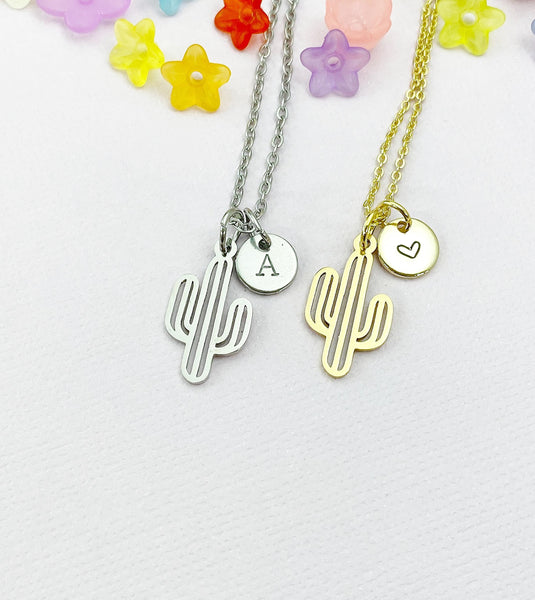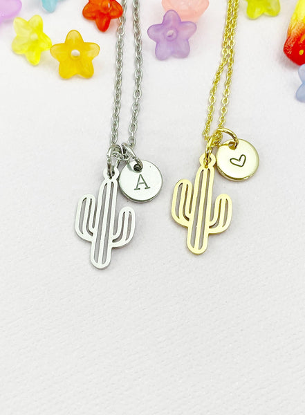 This is a gold-tone Cactus charm with hand stamped initial charm on brass/stainless steel 18 inches chain or bracelet or keyring.