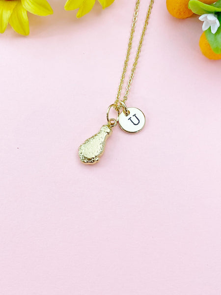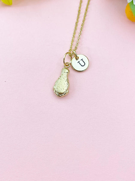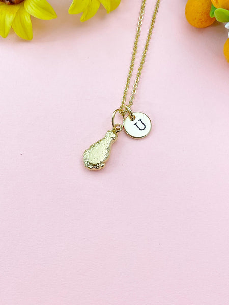 This is a gold -tone chicken leg charm with hand stamped initial charm on brass/stainless steel 18 inches chain or bracelet or keyring.