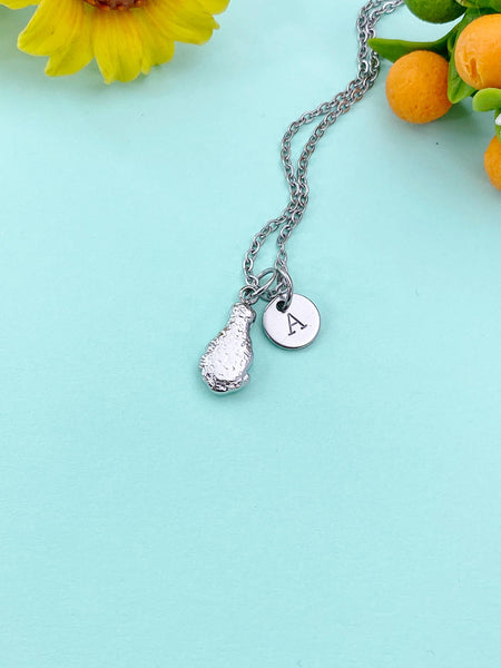 This is a silver -tone chicken leg charm with hand stamped initial charm on brass/stainless steel 18 inches chain or bracelet or keyring.