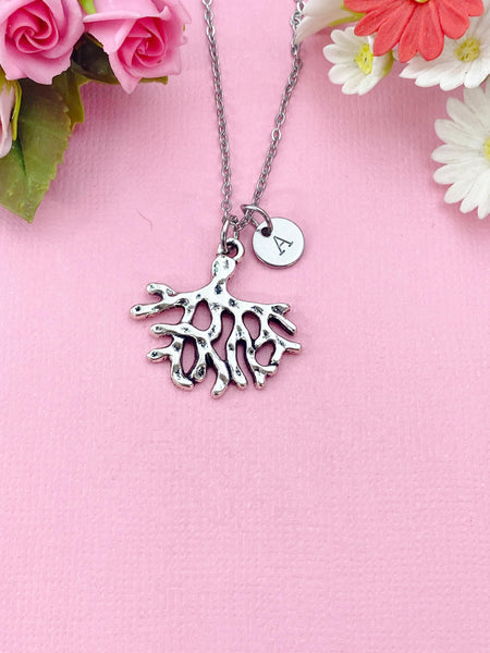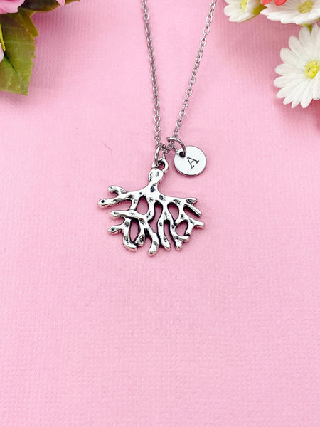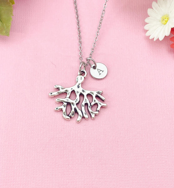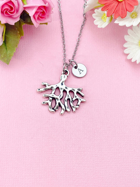 This is a silver -tone coral charm with hand stamped initial charm stainless steel 18 inches chain or bracelet or keyring.