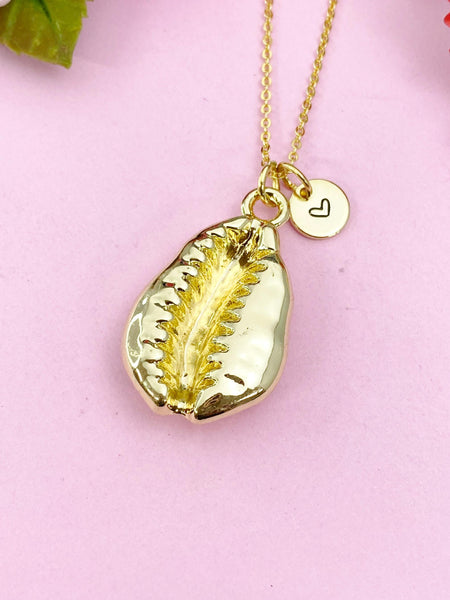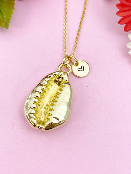 This is a gold tone Cowrie Shell charm with hand stamped initial charm on brass/stainless steel chain.