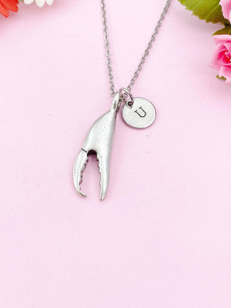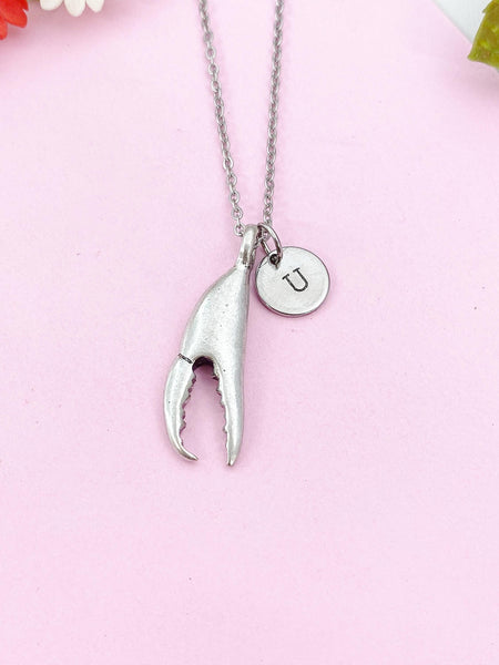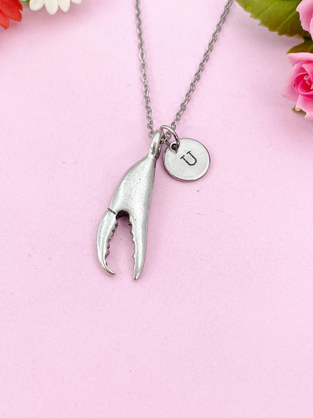 This is a silver tone Crab Claw charm with hand stamped initial charm on brass/stainless steel chain.