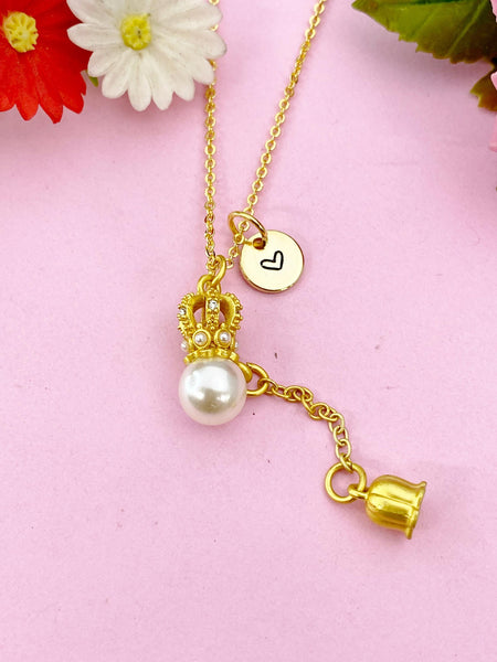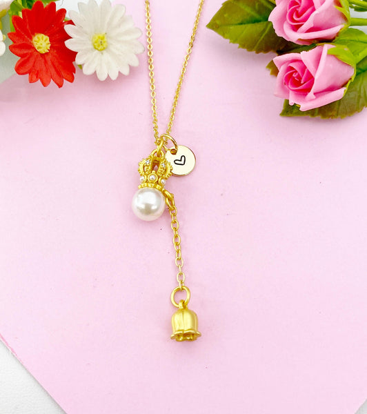 This is a gold tone Crown with Lily of Vally Bell Flower charm with hand stamped initial charm on brass/stainless steel chain.