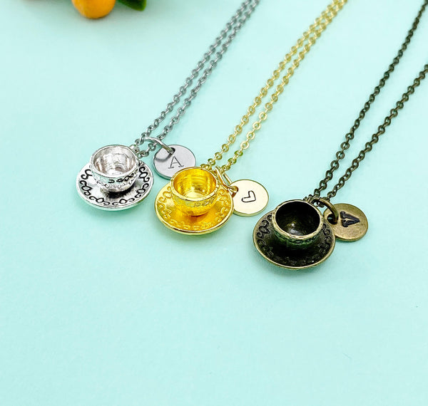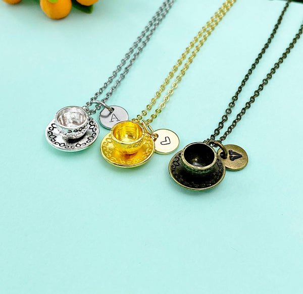 This is Cup and Saucer charm with hand stamped initial charm on brass/stainless steel 18 inches chain