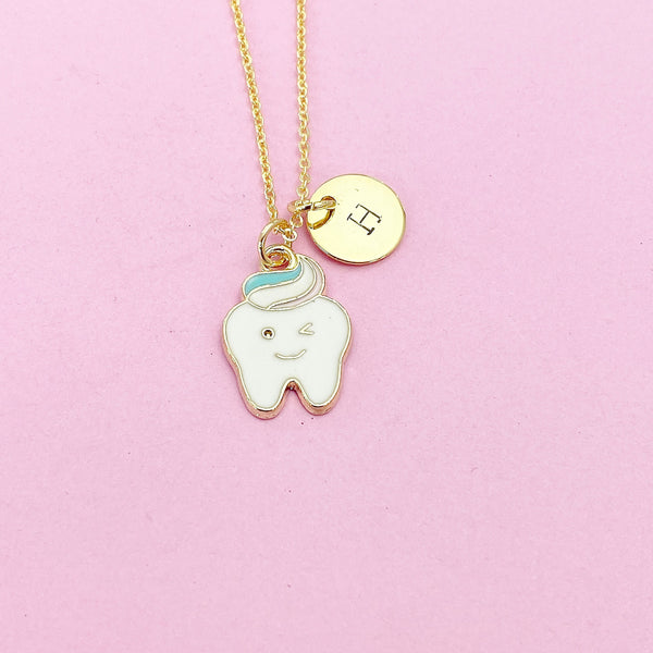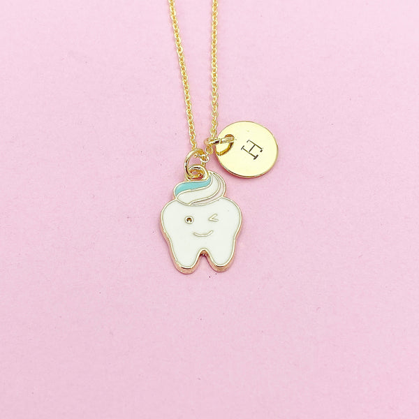 This is gold or silver tone cute tooth charm with hand stamped initial charm on brass or stainless-steel chain.