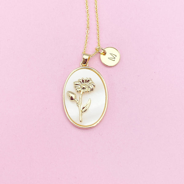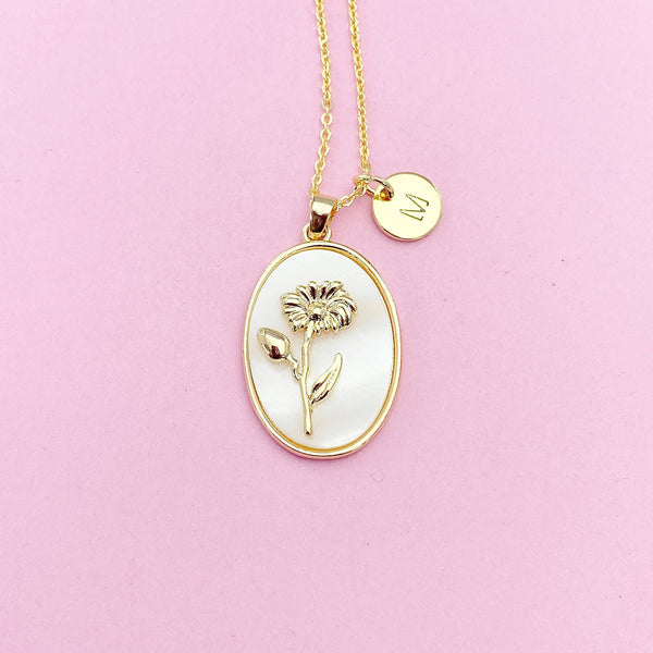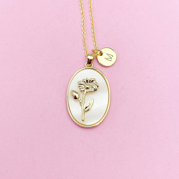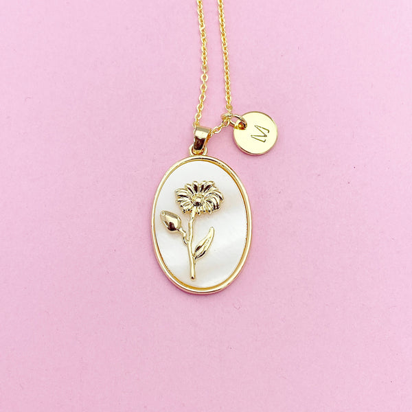 This is a gold -tone Daisy April Flower charm with hand stamped initial charm on brass/stainless steel 18 inches chain.