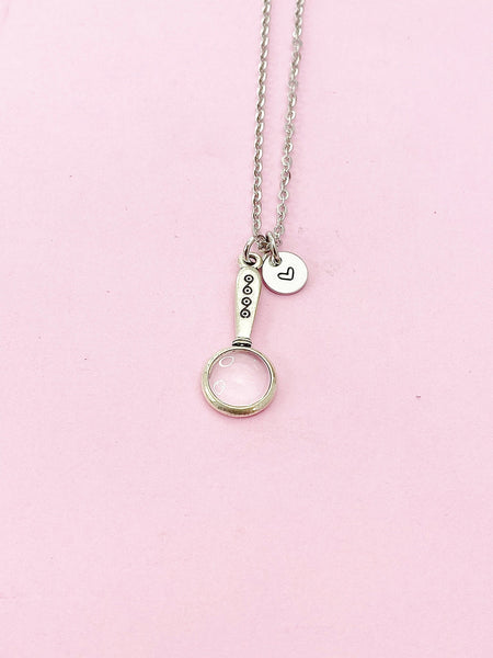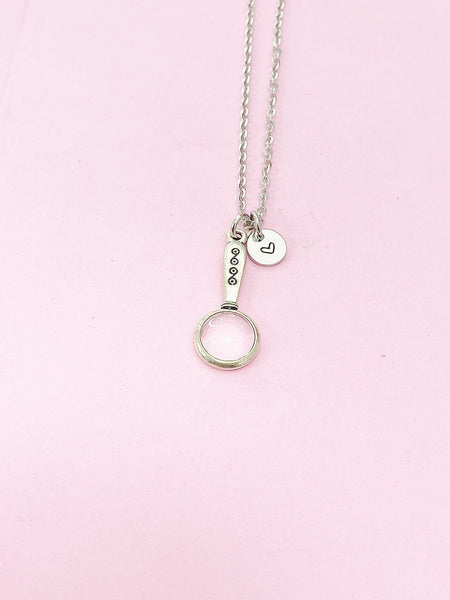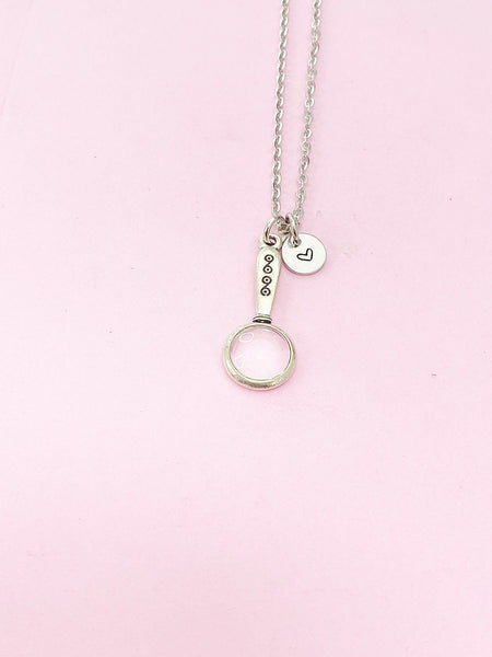 This is silver tone Detective Magnifying Glass charm with hand stamped initial charm on brass or stainless-steel chain.