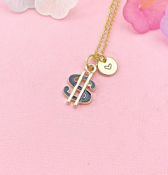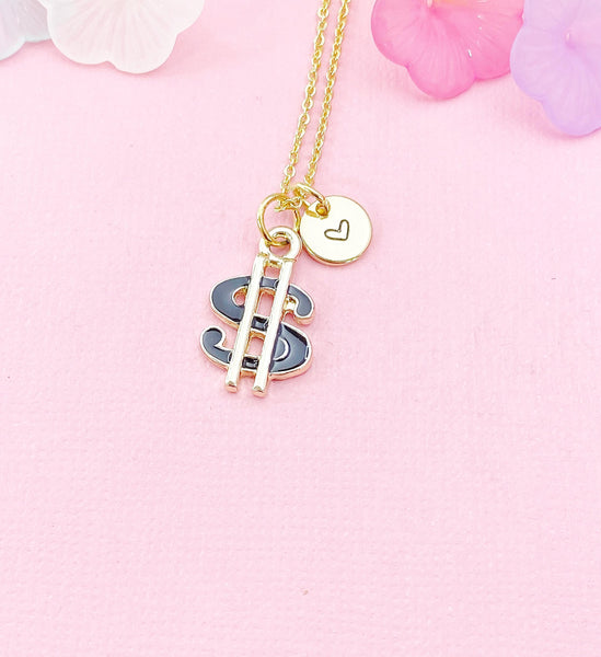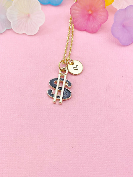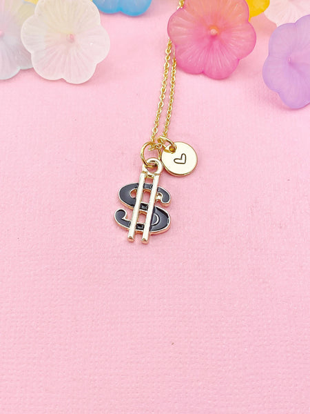 This is a gold -tone dollar charm with hand stamped initial charm on brass /stainless steel 18 inches chain or keyring.