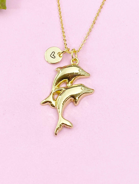 This is a gold tone dolphin charm with hand stamped initial charm on brass/stainless steel chain.