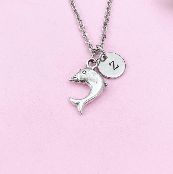This is a silver tone Dolphin charm with hand stamped initial charm on brass/stainless steel chain.