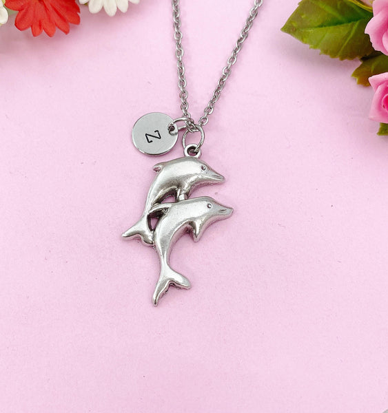 This is a silver tone Dolphin charm with hand stamped initial charm on brass/stainless steel chain.