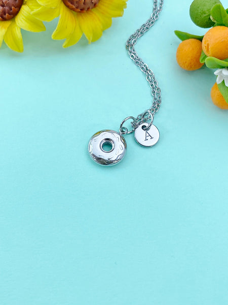 This is a silver -tone donut charm with hand stamped initial charm on brass/stainless steel 18 inches chain or bracelet or keyring.