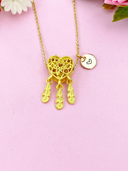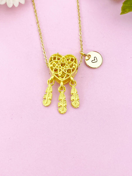 This is a gold tone Dreamcatcher Heart Feather with hand stamped initial charm on brass/stainless steel chain.