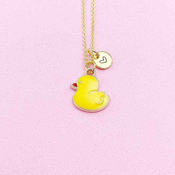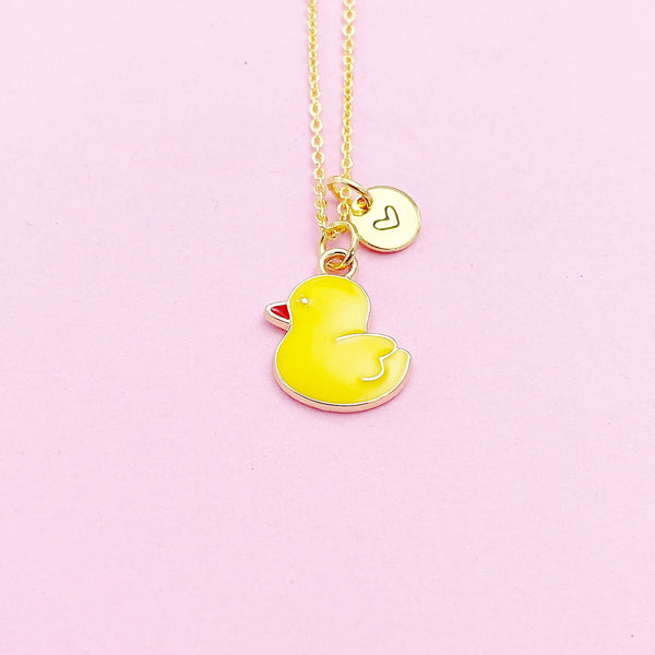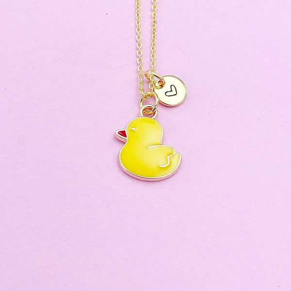 This is gold tone Cute Yellow Duckling charm with hand stamped initial charm on brass or stainless-steel chain.