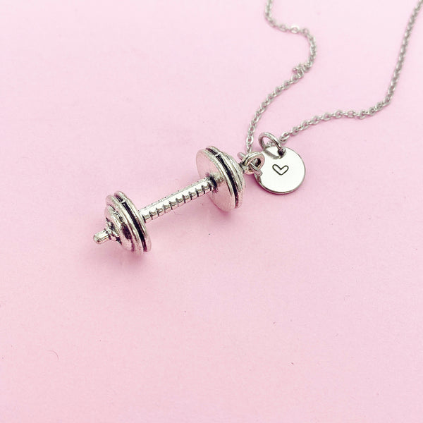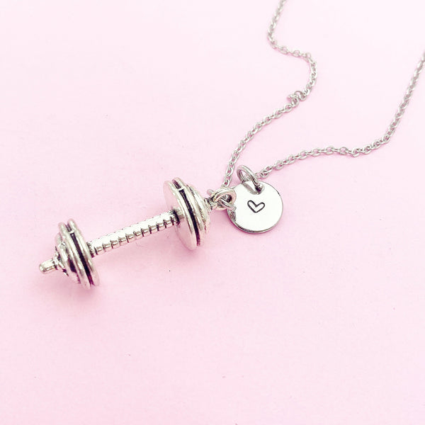 This is a silver-tone dumbbell charm with hand stamped initial charm on necklace.