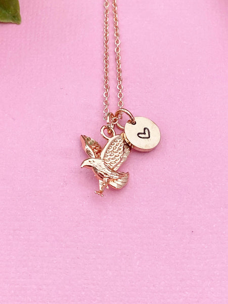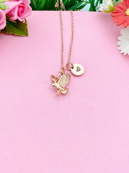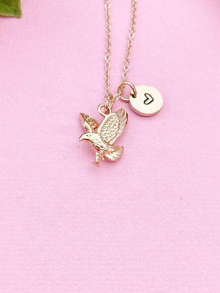 This is rose gold tone eagle charm with hand stamped initial charm on brass/stainless steel 18 inches chain.