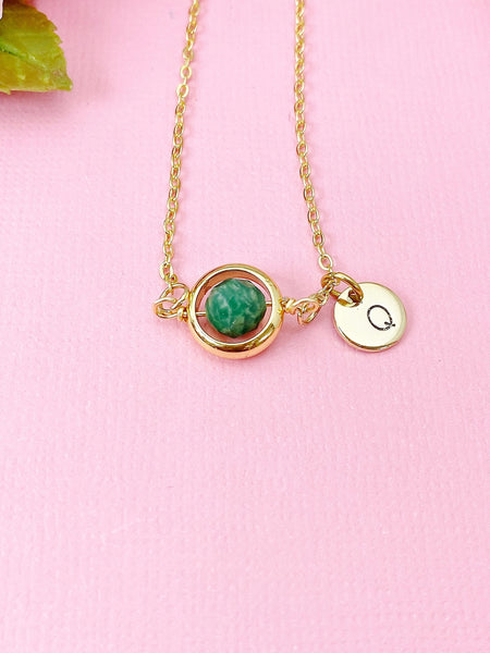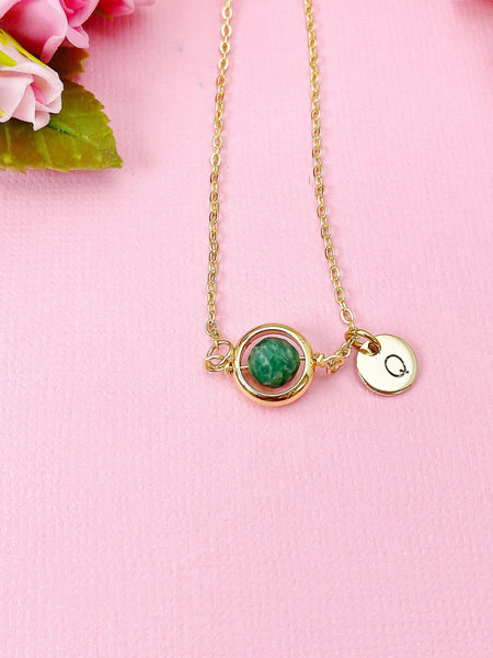 This is a gold tone Natural Emerald charm with hand stamped initial charm on brass/stainless steel chain.